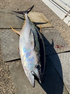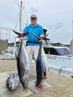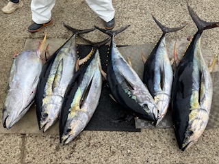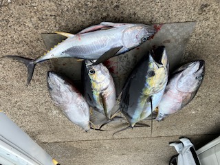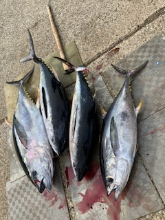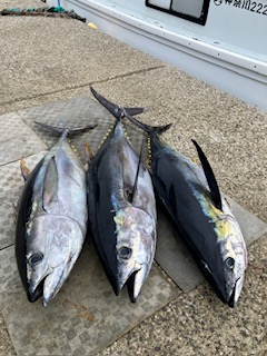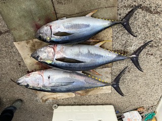 前半からキハダの当たりありました。 8号船は…バラシ・ハリス切れなど多数ありましたが。何とか3本ゲットでした。