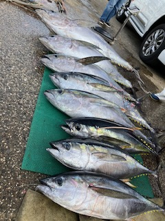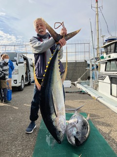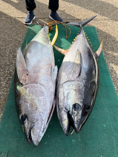 前半はなかなか船に反応付かず苦戦でした。 中盤から反応付き、当たりありました。 一隻はキハダ釣り初めてのお客さんでしたが、2名さまで4回当たり、3本ゲットで12時に帰港でした。 もう一隻はその後も当たり拾え、キメジ混じり9本ゲットでした。 最大68キロのモンスターもゲットでしたm(_ _)m