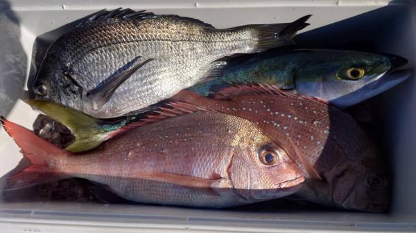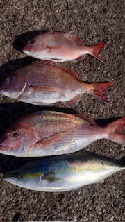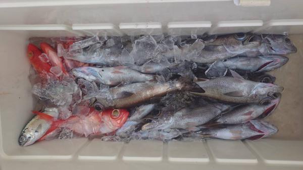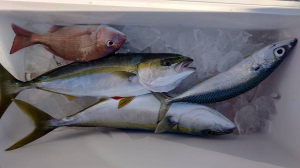朝からアジは大・中・小混じり顔を見れました。 泳がせは…中盤から狙い、ワラサ1本、真鯛1枚、ショゴ1匹、マトウダイ多数でした。 アジは皆さんお土産ゲットでしたm(_ _)m